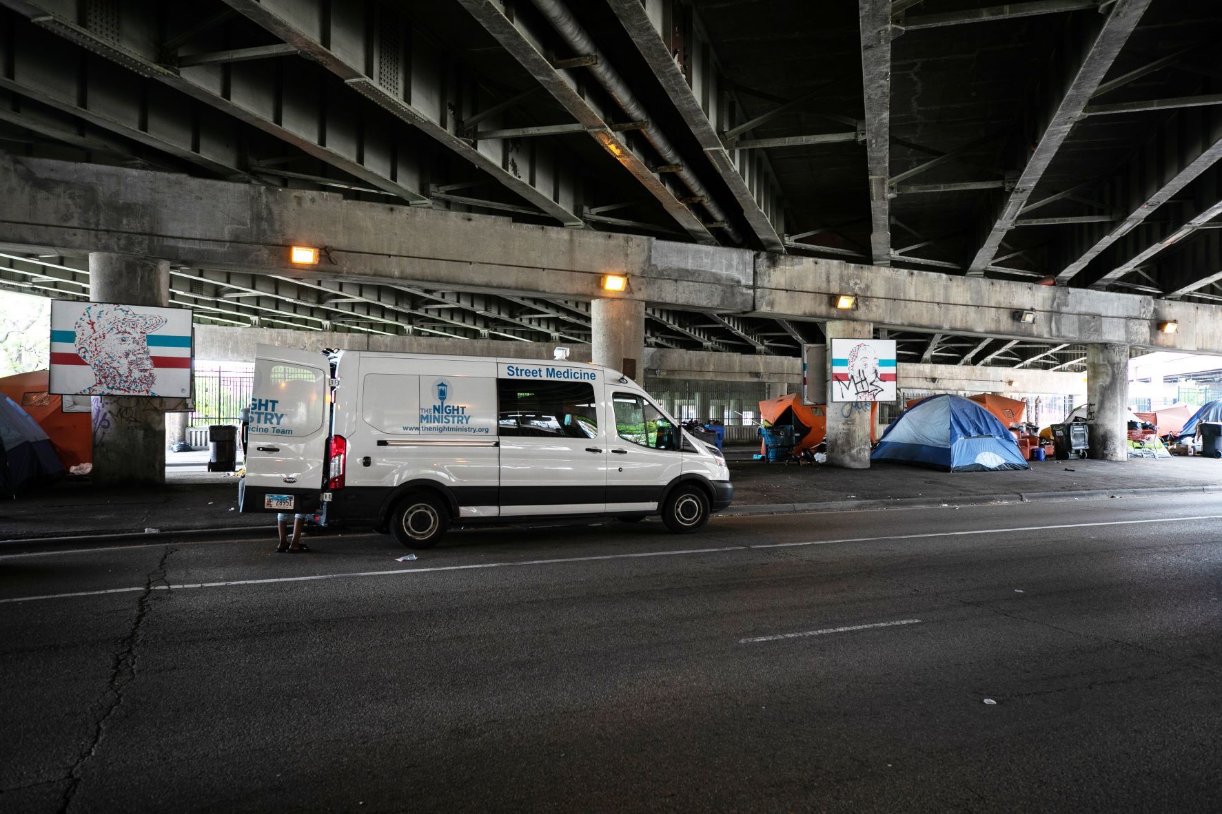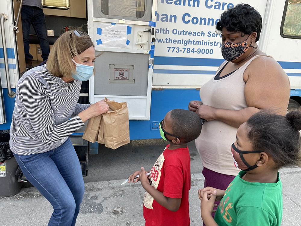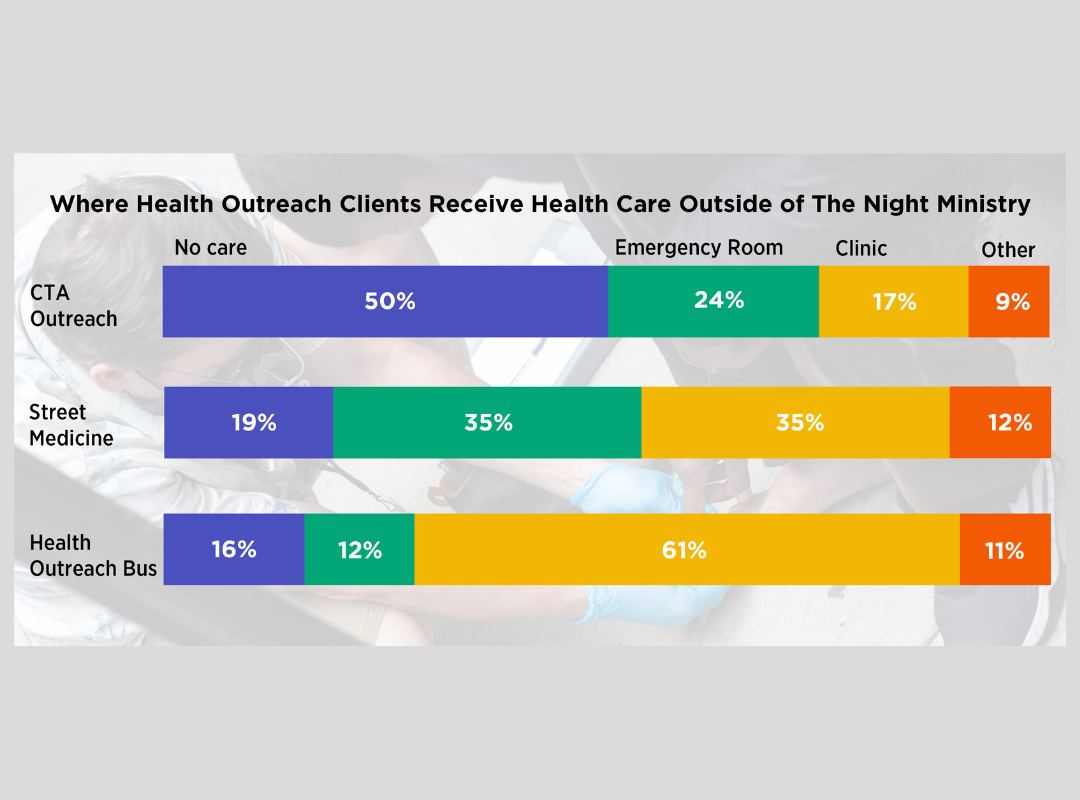 The Night Ministry’s Health Outreach Program provides free lifesaving care through its Health Outreach Bus and Street Medicine teams, which bring medical services, food, and essential supplies directly to people where they live — whether on the streets, under viaducts, or in encampments. Each year, these programs connect thousands of individuals with critical care, resources, and pathways to housing and stability.