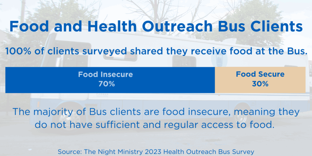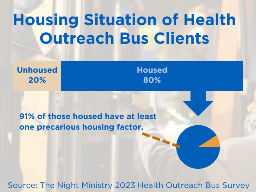 Finding a stable place to live, getting enough to eat, and receiving health care when they need it – these are the everyday concerns of many of the community members who visit The Night Ministry’s Health Outreach Bus, according to a recent survey from the agency’s Learning and Impact department.