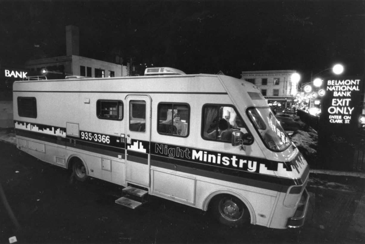 The Night Ministry was established in 1976 when a coalition of diverse North Side congregations hired Rev. Tom Behrens to conduct outreach to individuals experiencing isolation, despair, and homelessness. Behrens initially operated from the trunk of his car, conducting street outreach in nighttime locations where vulnerable populations gathered. In 1982, after encountering homeless youth, Behrens expanded the organization’s focus to address youth homelessness specifically. The organization formalized its volunteer program in 1984, recruiting community volunteers for street outreach while hiring dedicated staff for youth services.